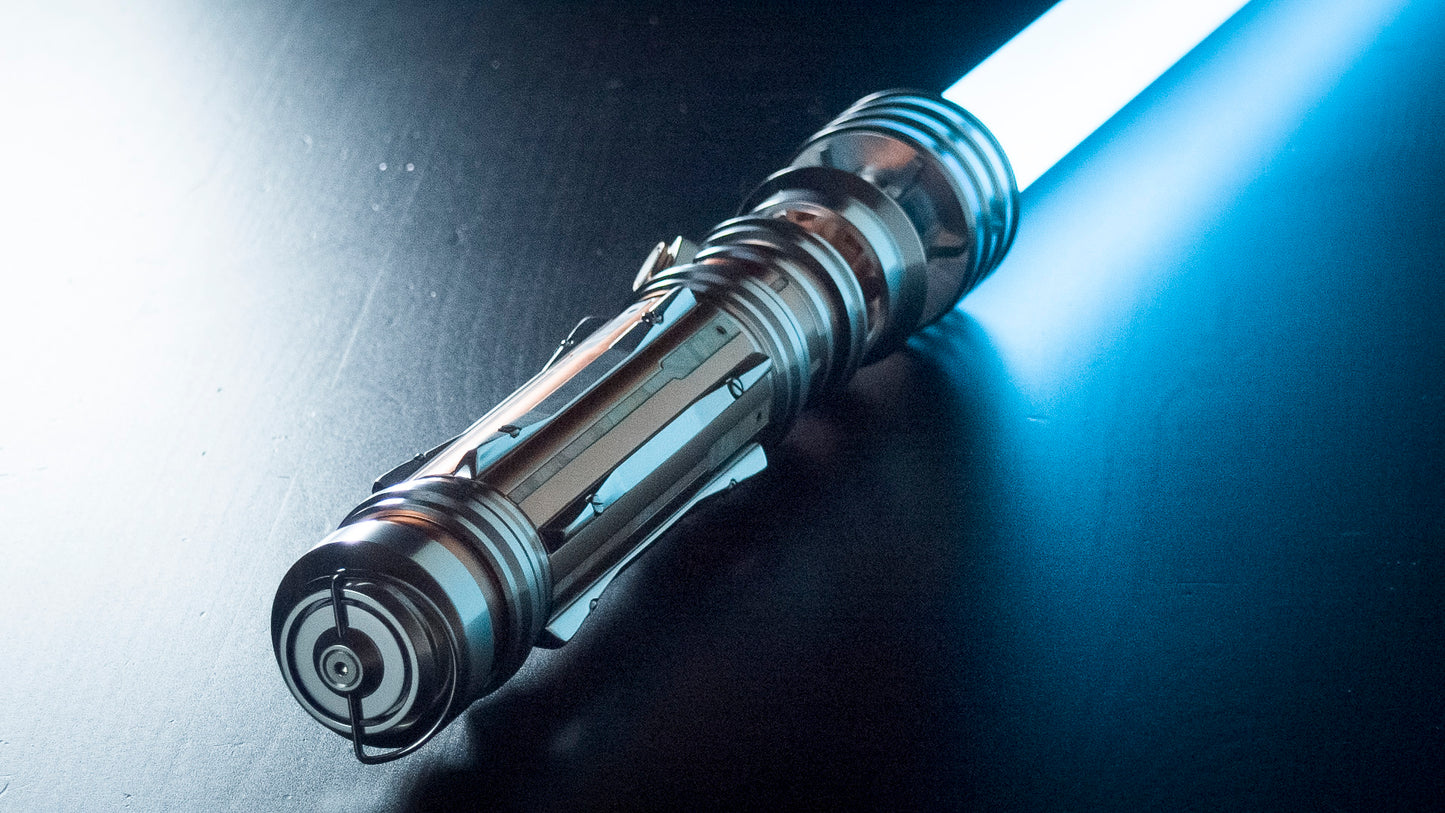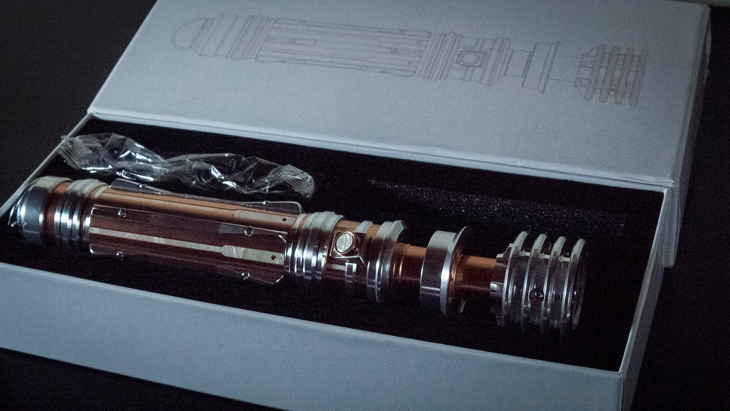 This saber is made from polished and anodized aircraft aluminum with pearl inlays to accurately reproduce the original prop. The saber features a removable resin printed chassis, accent LEDs, and a lit pixel PCB.
