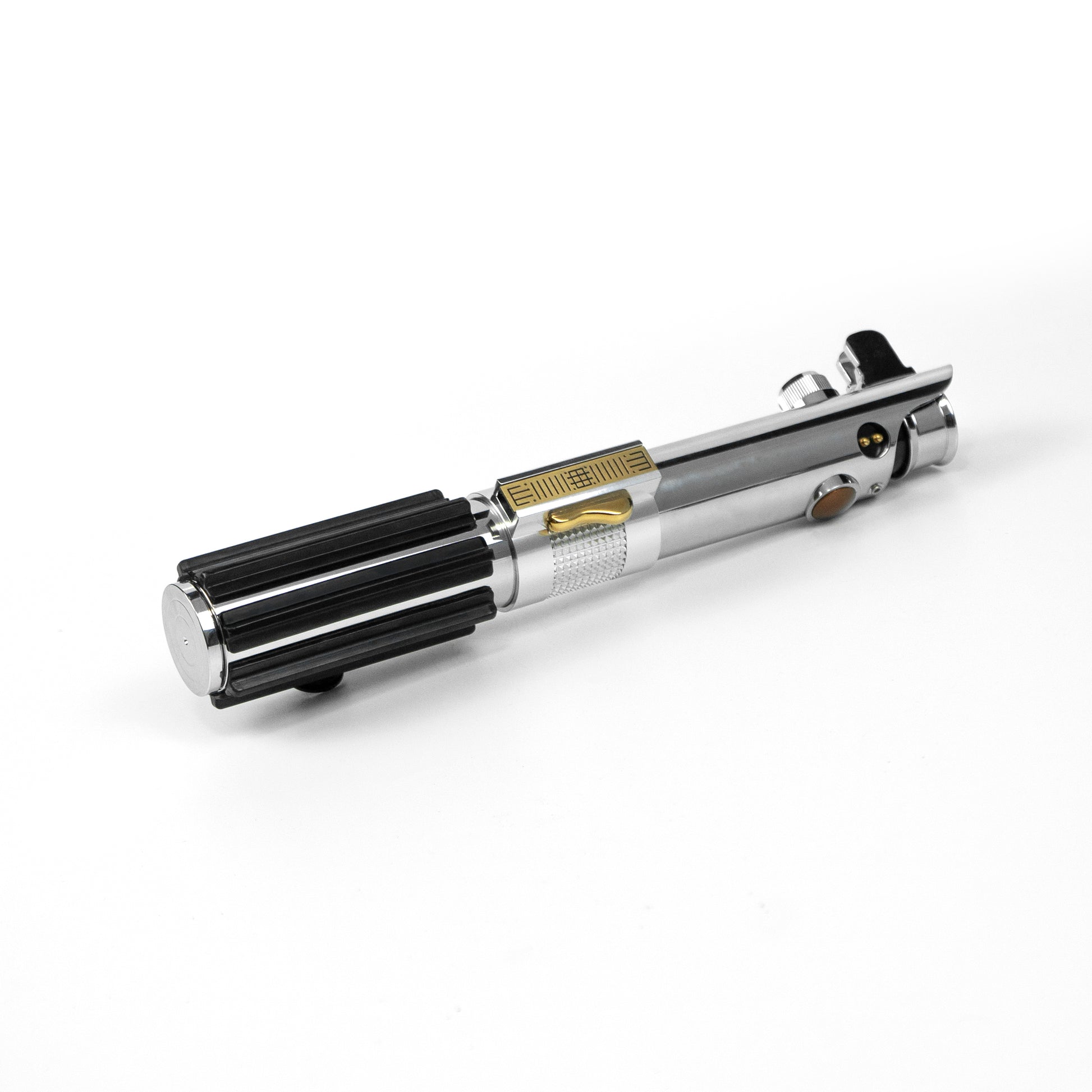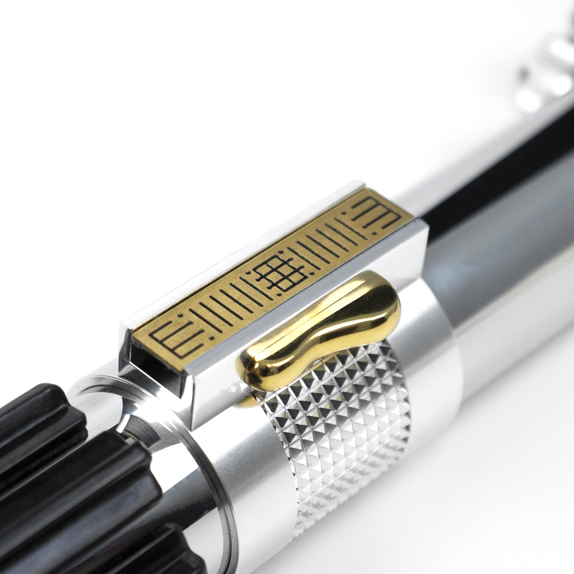This saber is made of plated brass and aircraft aluminum to accurately replicate the original saber prop. The saber features a removable resin printed chassis with accent LEDs and a pixel PCB.